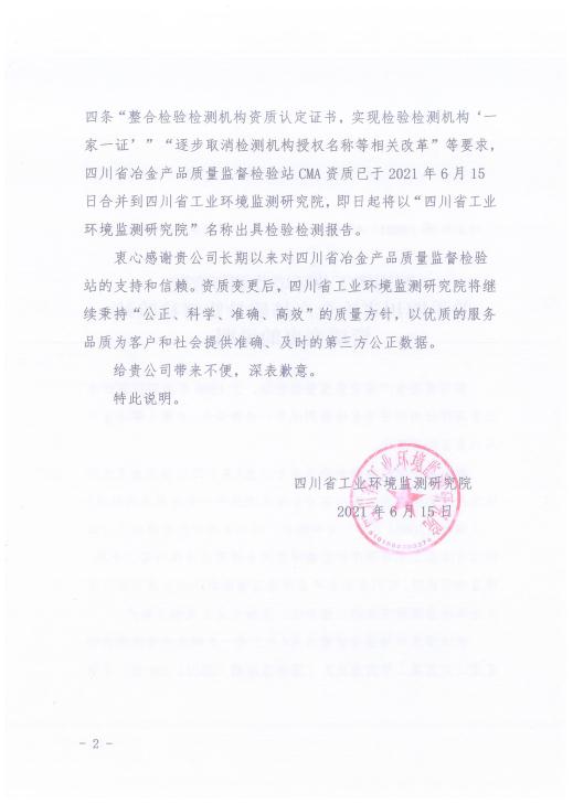 关于四川省冶金产品质量监督检验站资质变更的说明